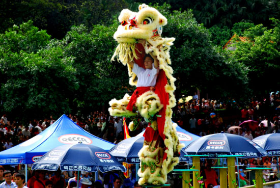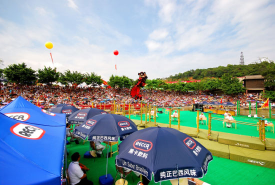 2007年“黃飛鴻杯”第三屆世界華人獅王爭霸賽在西樵山天湖公園拉開戰(zhàn)幕。來自世界各地13路“雄獅”展開絕技,爭奪世界第一獅王和水上獅王桂冠?!包S飛鴻杯”世界獅王爭霸賽共吸引了來自德國、澳大利亞、意大利、新加坡、美國以及中國香港、澳門、臺北和南海等國家和地區(qū)的13路獅王。其中,10路獅王決戰(zhàn)陸地高樁,另外3路獅王決戰(zhàn)水上飛樁。西樵黃飛鴻獅隊是代表中國大陸參戰(zhàn)陸地高樁的唯一獅隊。